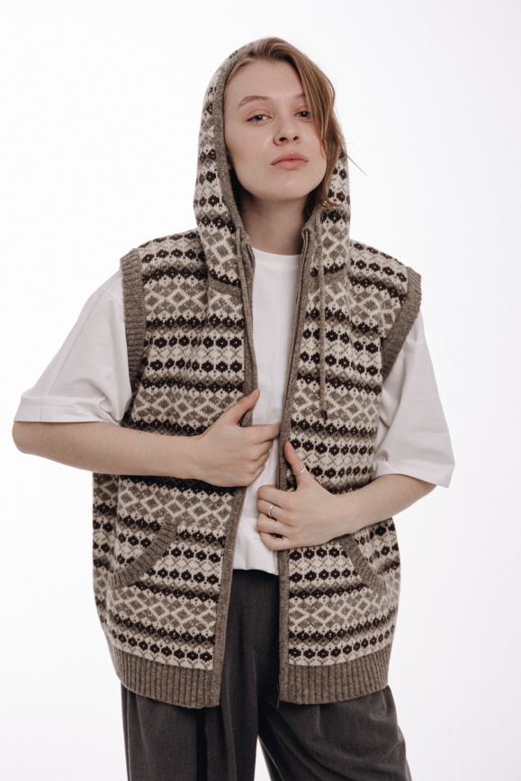 Жилет с капюшоном серый из 100% шерсти яка